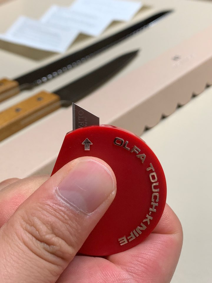 택배 박스나 우편물을 뜯을 때 사용 가능한 터치 나이프는 원형의 디자인으로 작지만 그립감이 좋습니다.